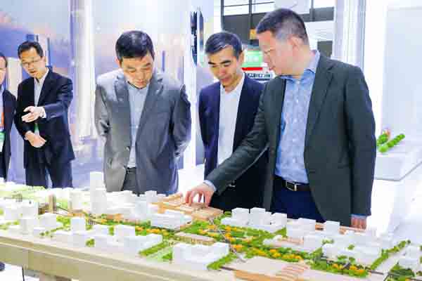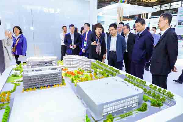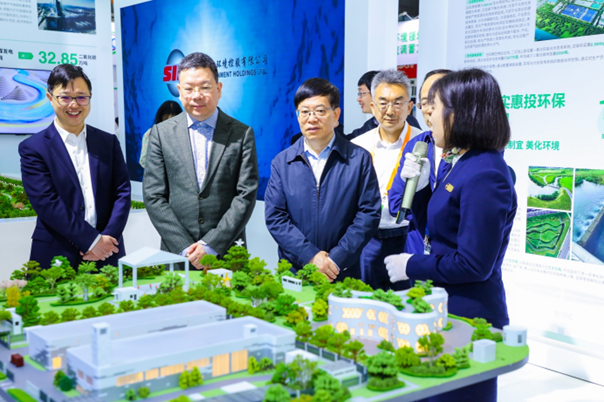 展会现场,市政协副主席金兴明、市政协人资环建委专委会主任马静、市生态环境局党组书记、副局长唐家富、现代服务业联合会常务副会长孙建平、市国资委副主任马晓宾、市生态环境局副局长柏国强,莅临上实展台,上实集团总裁周军,上实控股副行政总裁、上实环境CEO阳建伟等陪同参观。
