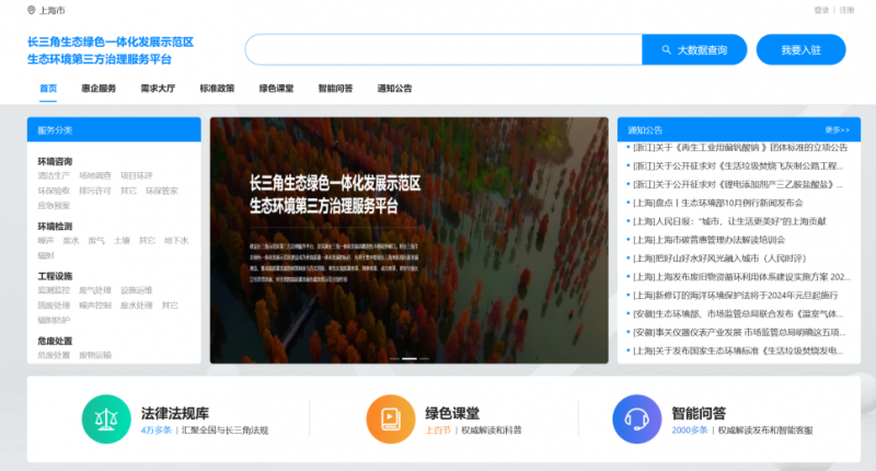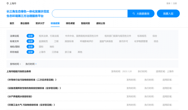 [法规政策随时查] 服务平台着力打造长三角环境信息集成平台,增加通知公告版块,汇总长三角四地环保工作通知公告,生态环境政策法规等环境信息,提供方便快捷的信息查询服务。