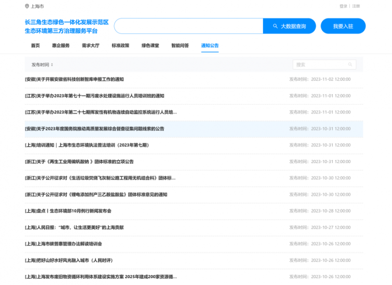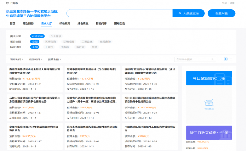 [政采招标及时看] 服务平台优化搜集长三角四地生态环境政采需求(包括官方渠道的招标公告、采购公告等信息),搭建供需桥梁,促进长三角区域环境要素自主有序流动。