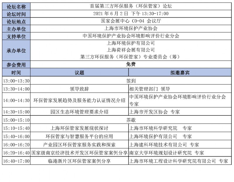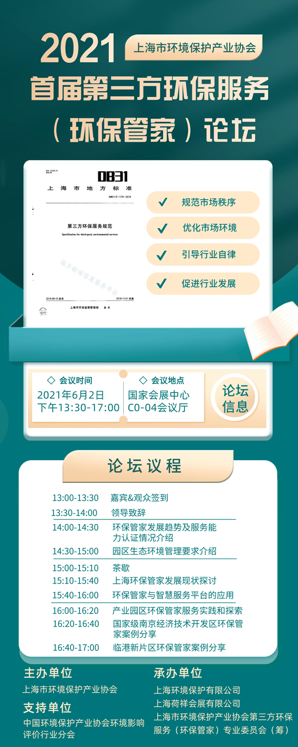 为了落实贯彻上海发布的地方标准《第三方环保服务规范》(DB31/T 1179-2019)和中国环境保护产业协会发布的《关于开展环境咨询(环保管家)服务认证试点工作的通知》要求和精神,加快构建现代环境治理体系新要求,引导第三方环保服务市场健康有序发展,多多28将于2021年6月2日在国家会展中心举办首届第三方环保服务(环保管家)论坛。