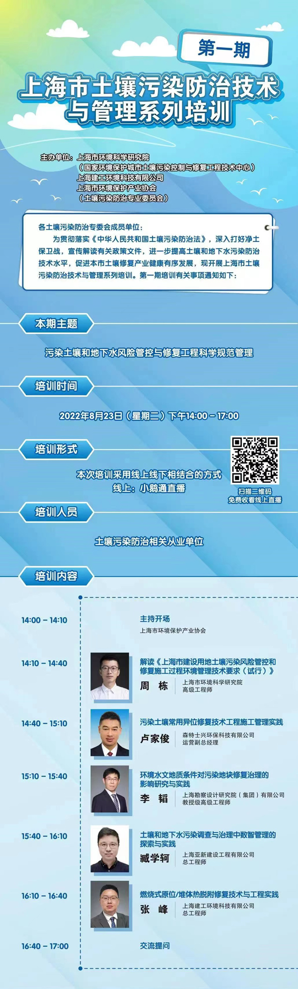 为贯彻落实《中华人民共和国土壤污染防治法》,深入打好净土保卫战,宣传解读有关政策文件,进一步提高土壤和地下水污染防治技术水平,促进本市土壤修复产业健康有序发展,现开展上海市土壤污染防治技术与管理系列培训。第一期培训有关事项通知如下: