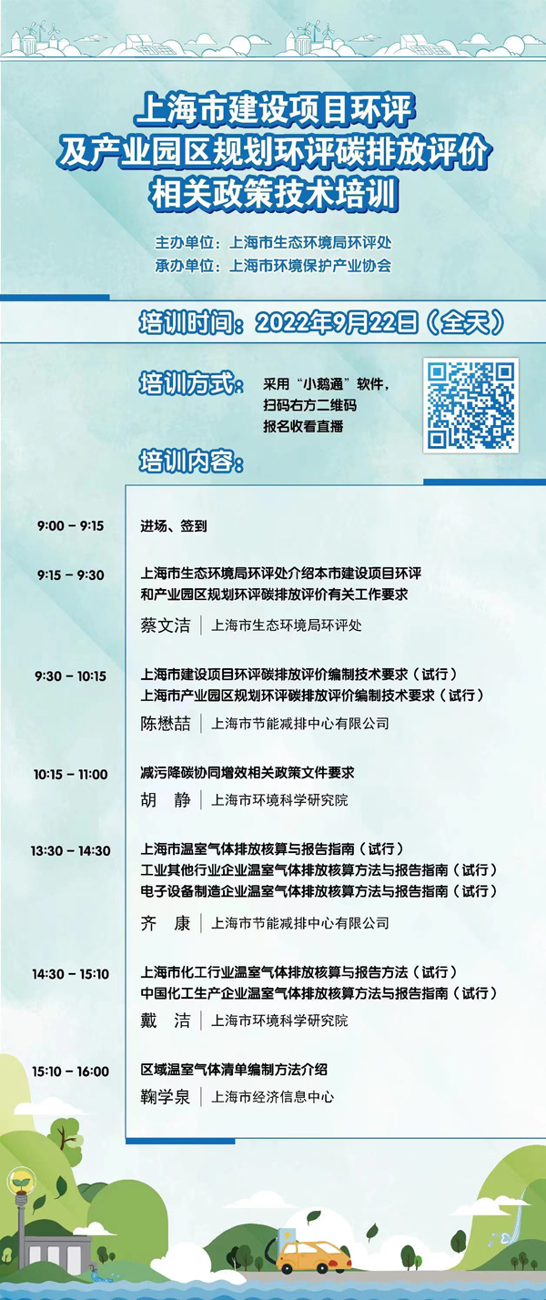 为贯彻落实碳达峰、碳中和的重大战略决策,推动污染物和碳排放环境影响评价管理统筹融合,促进减污降碳协同增效,由上海市生态环境局环评处主办、多多28承办的“上海市建设项目环评及产业园区规划环评碳排放评价相关政策技术培训”即将开班。