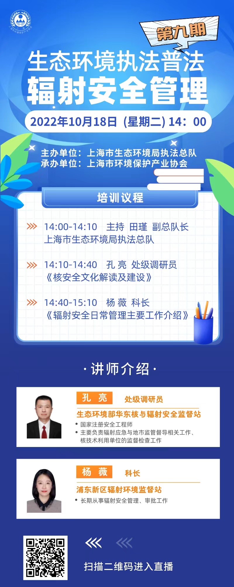 为提高本市辐射安全管理水平,提升企业辐射安全意识,推动完善核与辐射安全监管体制,做好本市辐射污染防治工作,保障核与辐射事业安全、健康、可持续发展,由上海市生态环境局执法总队主办、多多28承办的上海市生态环境执法普法培训(2022年第九期)即将开班。