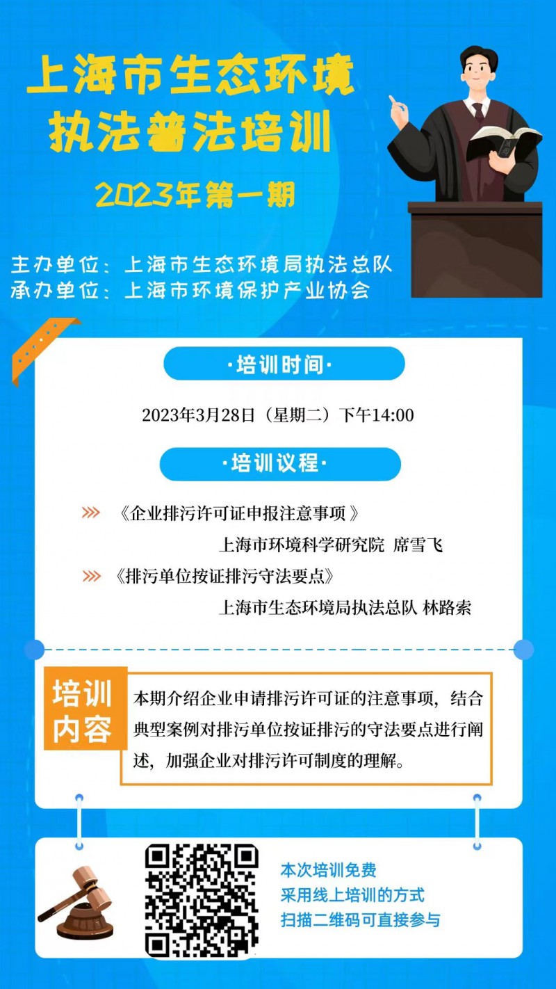 《排污许可管理条例》已正式施行逾两年。为持续巩固提升本市排污许可工作质量,提升排污企业申请效率,宣传排污许可守法要点,由上海市生态环境局执法总队主办、多多28承办的上海市生态环境执法普法培训(2023年第一期)即将开始。