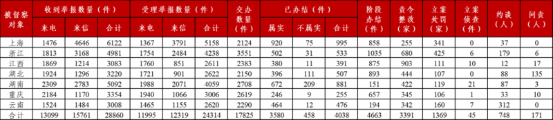 截至6月1日晚20:00,各督察组共收到群众来电、来信举报28860件,受理有效举报24314件,经梳理合并重复举报,累计向有关省(市)转办17825件。有关省(市)已办结或阶段办结8701件。其中,立案处罚1369家,立案侦查45件;约谈党政领导干部748人,问责党政领导干部171人。