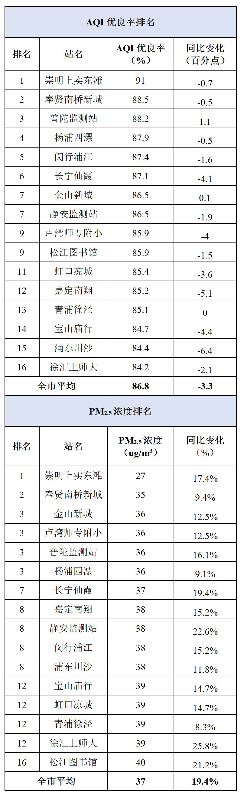 全市16个区国控城市点位环境空气质量AQI优良率和PM2.5浓度排名如下: