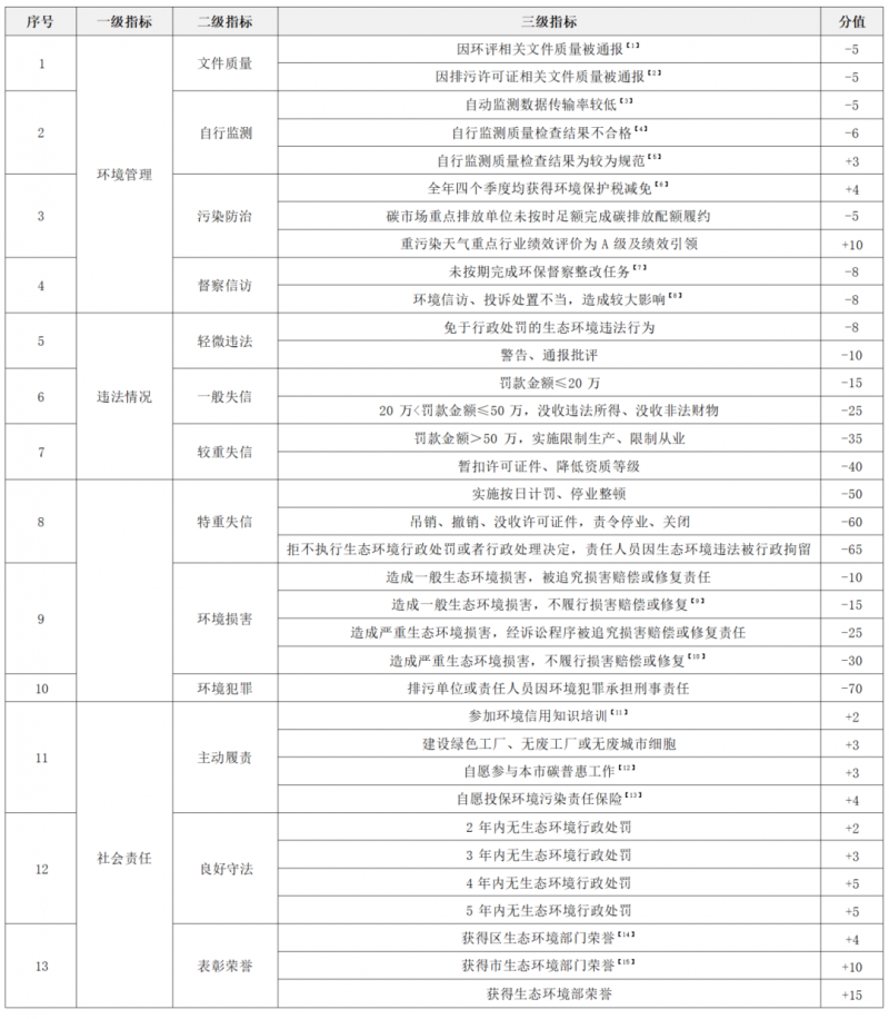 13.指标影响年限说明:根据排污单位生态环境行为影响程度,对评价指标设置不同的影响年限。环境管理、社会责任类,以及违法情况类中的环境损害指标,仅在评价年度内实施加减分。违法情况类的轻微违法指标,违法行为未改正的,在评价年度内实施减分;一般失信指标,未完成信用修复的,在评价年度及后两年均实施减分;较重失信和特重失信指标,完成信用修复的,评价年度按上一级指标最高扣分项减分,之后每年减分逐级递减,直至不再扣分;未完成信用修复的,在评价年度及后两年均实施减分;环境犯罪指标,自审判机关下达刑事判决后连续三个评价年度均实施减分。生态环境信用修复应按照《关于进一步完善本市公共信用信息修复机制的工作方案》的相关规定实施。