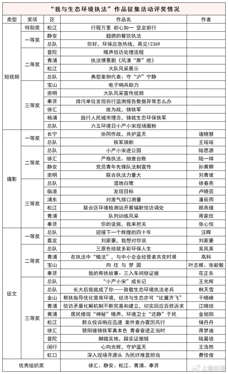 会议对“我与生态环境执法”作品征集活动开展情况进行了介绍。2024年是上海市环境执法系统成立40周年,为进一步弘扬生态环保铁军精神,激发干事创业的工作热情,由总队牵头,在全市环境执法系统组织开展了“我与生态环境执法”作品征集活动,得到了全市生态环境执法系统及退休人员的大力支持和积极投稿,共收到征文作品63篇,摄影作品161张,短视频32条。通过网络投票、专家评选,在投稿作品中,评出优秀获奖短视频12个,优秀摄影作品12张,优秀征文16篇。在此基础上组织开展“我与生态环境执法”摄影展,优秀视频作品在上海环境、中国环境视频号上集中推送,优秀征文汇编成册,取得了良好反响。