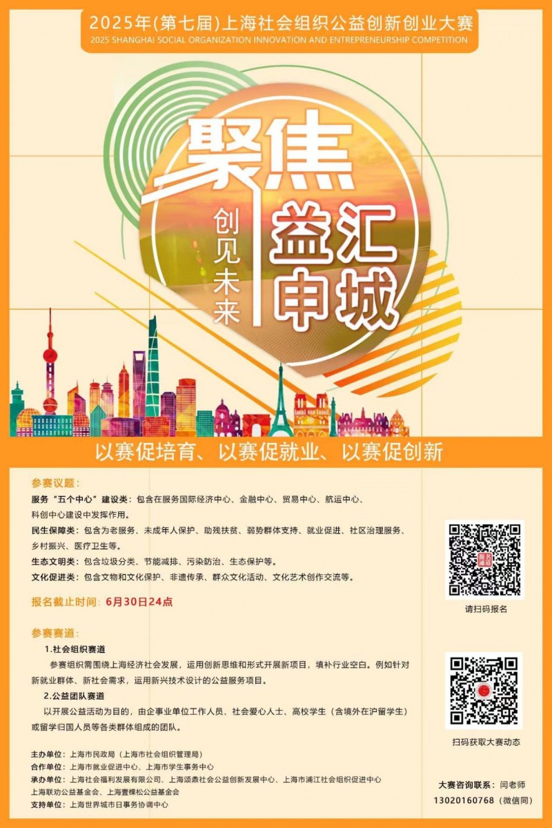 第七届大赛继续秉持“以赛促培育、以赛促就业、以赛促创新”的宗旨,搭建集培育、赋能、展示、交流于一体的大赛平台,更好发挥社会组织功能,服务基层社会治理,助力上海现代化建设。