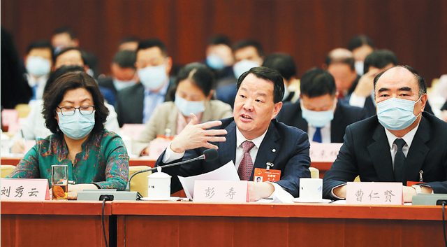 ↑3月6日上午,人大安徽代表团举行全体会议。全国人大代表彭寿(中)在发言时说:绿色发展是一场观念变革、技术变革、业变革,是我国实现高质量发展,推动生态效益、经济效益、社会效益“三效合一”的基础。徐国康摄(中经视觉)