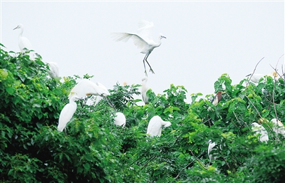 江苏省太仓市沙溪镇庄西村一片树林里成群的鹭鸟日前在林间蹁跹起舞。近几年来,沙溪镇加强环境治理,生态环境明显改善,成为鸟儿栖息的天堂。人民图片网供图