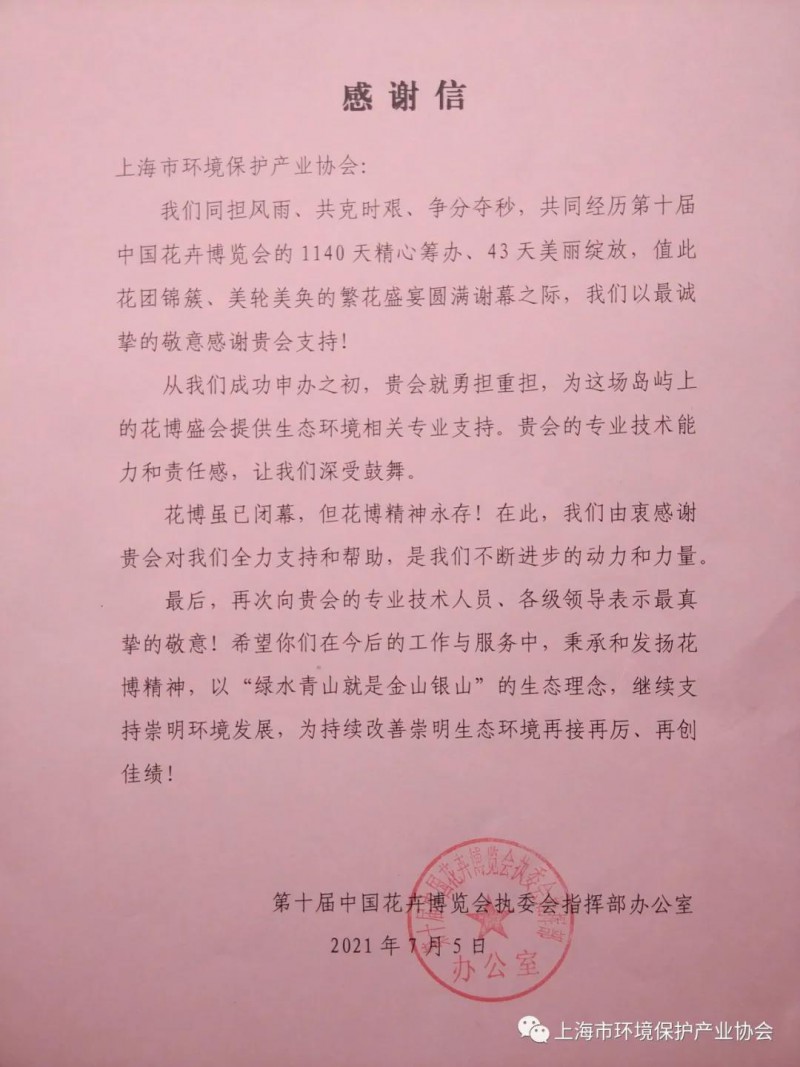 感谢信 我们同担风雨、共克时艰、争分夺秒,共同经历第十届中国花卉博览会的1140天精心筹办、43天美丽绽放,值此花团锦簇、美轮美奂的繁花盛宴圆满谢幕之际,我们以最诚挚的敬意感谢贵会支持! 从我们成功申办之初,贵会就勇担重担,为这场岛屿上的花博盛会提供生态环境相关专业支持。贵会的专业技术能力和责任感,让我们深受鼓舞。 花博虽已闭幕,但花博精神永存!在此,我们由衷感谢贵会对我们全力支持和帮助,是我们不断进步的动力和力量。 最后,再次向贵会的专业技术人员、各级领导表示最真挚的敬意!希望你们在今后的工作与服务中,秉承和发扬花博精神,以“绿水青山就是金山银山”的生态理念,继续支持崇明环境发展,为持续改善本市生态环境再接再厉、再创佳绩! 第十届中国花卉博览会执委会指挥部办公室 2021年7月5日