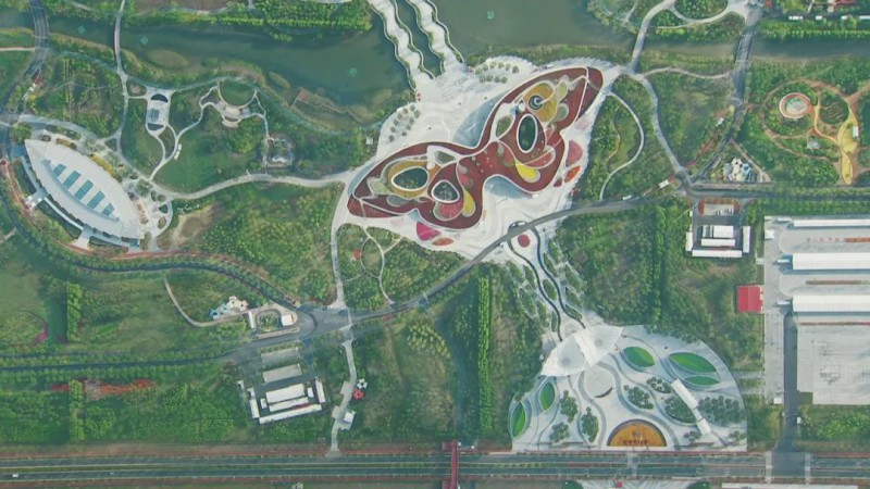 此外,花博园还利用可再生能源降低温室气体排放。复兴大道上的观花长椅,由500多万个牛奶盒回收材料制成;复兴馆“折纸屋顶”融入了太阳能光伏发电组件、采光天窗一体化设计,每年可减少碳排放量100吨。