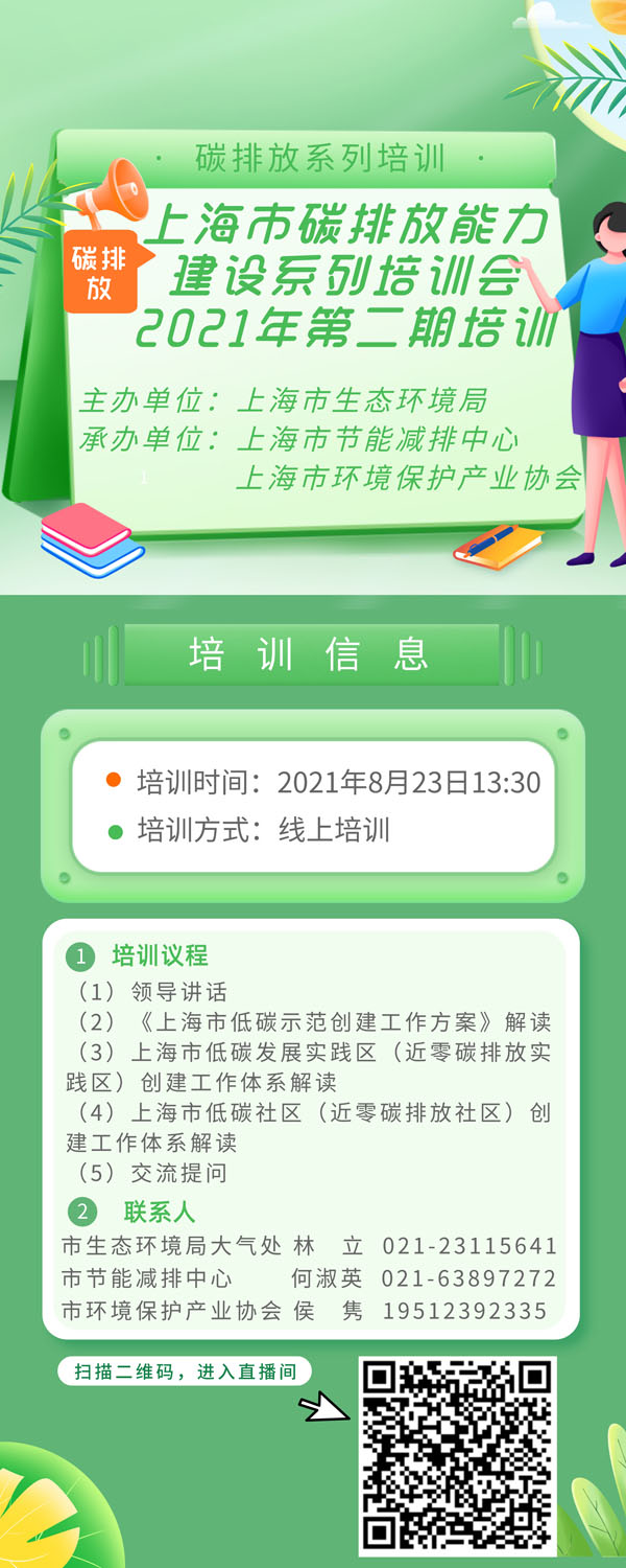 为了全面贯彻落实党中央作出的碳达峰、碳中和目标要求,引领倡导全社会绿色低碳转型,积极推进本市“十四五”期间低碳示范创建工作,上海市碳排放能力建设系列培训2021年第二期将于2021年8月23日下午举行。本次培训由上海市生态环境局主办,上海市节能减排中心和多多28承办。