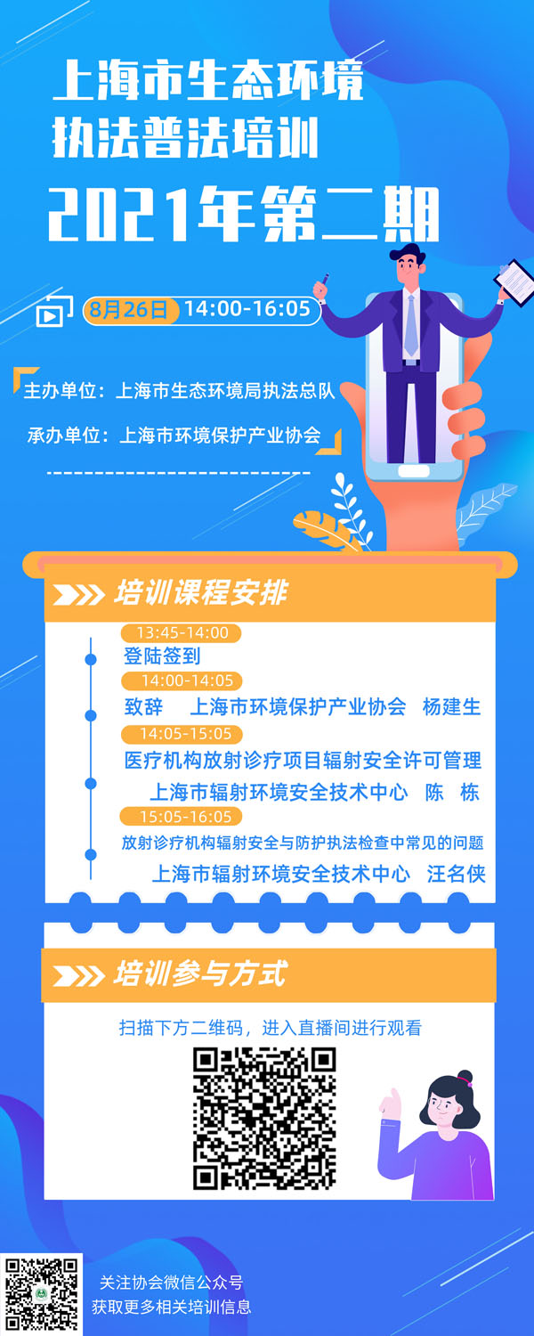 为提升上海市辐射安全许可管理水平,加强辐射安全与防护执法检查工作,上海市生态环境局执法总队现面向各类医疗机构、部分养老机构和护理院等单位开展上海市生态环境执法普法系列培训会(2021年第二期)。