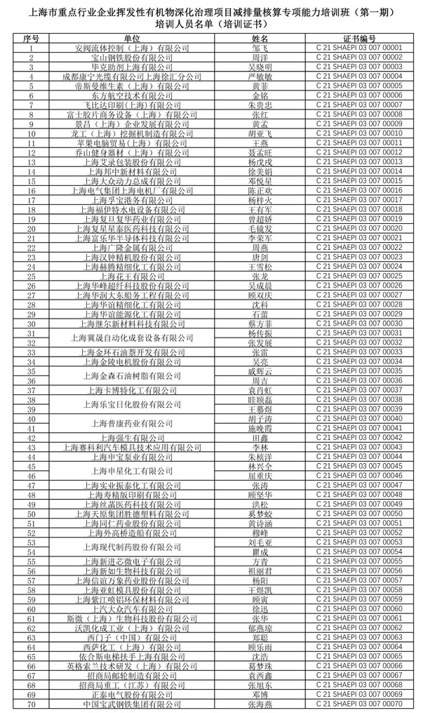 上海市重点行业企业挥发性有机物深化治理项目减排量核算技术专项培训(第一期)考核合格者名单