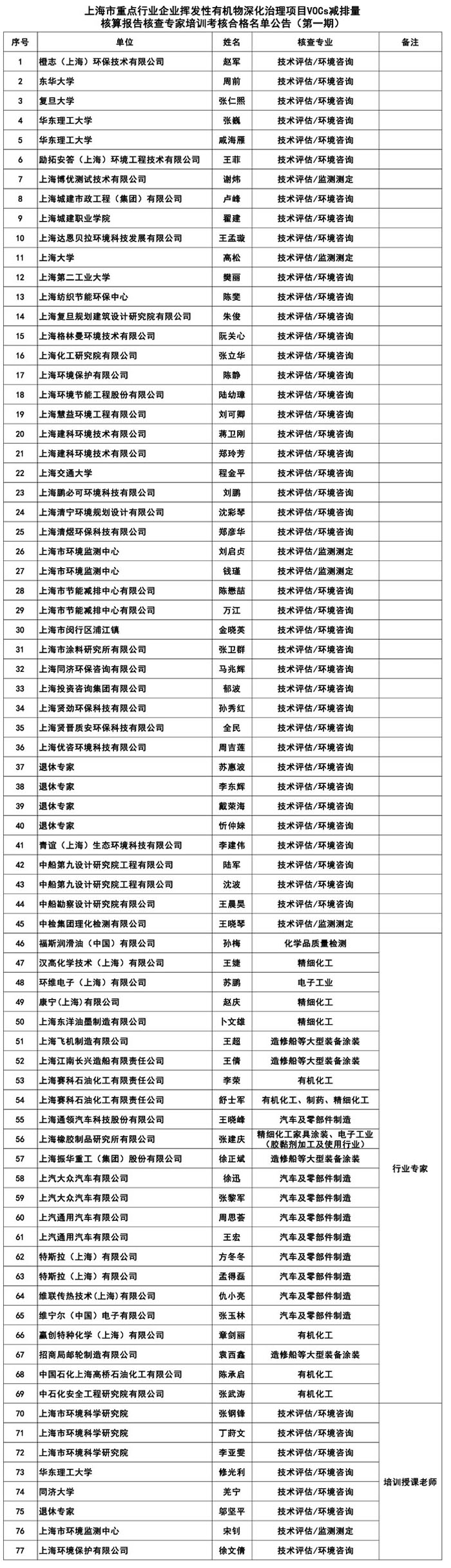 上海市重点行业企业挥发性有机物深化治理项目VOCs减排量核算报告核查专家培训在2022年1月16日完成首次培训及相关工作。经初步整理并综合《上海市重点行业企业挥发性有机物深化治理项目VOCs减排量核查专家培训专业资质自我声明》填报情况,现将第一期专家名单公告如下:
