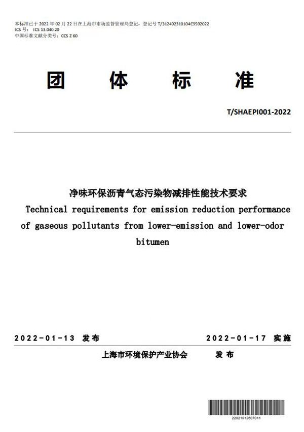 2022年1月13日,根据《多多28团体标准管理办法》的有关规定,由上海建科环境技术有限公司主编的团体标准《净味环保沥青气态污染物减排性能技术要求》(T/SHAEPI001-2022)批准发布,并于2022年1月17日正式实施。
