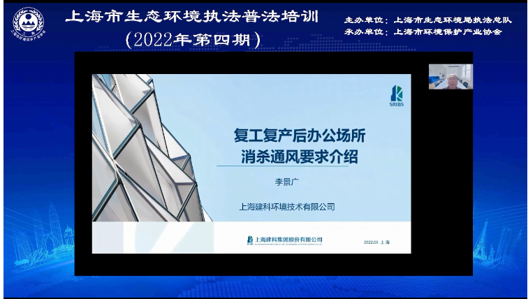 上海市生态环境局执法总队副总队长叶茂指出:市生态环境局近期推出33条措施,着力优化行政许可、审批服务、优化一网通办服务,助力本市企业事业单位和生产经营者复工复产,各参训单位和人员要坚持疫情防控不放松,牢记环保“三字诀”。 他表示“疫情终会过去,生活还要继续,经济必将进步,环境会更美好,祝愿各位企业家朋友善用政府优惠政策、团结家人员工、齐心协力、同舟共济、迎来更大更好的发展!” 上海市生态环境局执法总队朱杰老师从污染治理设施及环境管理、突发环境事件及安全生产隐患排查、涉疫相关管理工作三方面,细致解读复工复产阶段工作要点,同时通过典型执法案例深刻解析固定污染源自动监控环境管理守法要点,为有序复工复产提供指引。 上海建科环境技术有限公司教授级高工李景广介绍了办公场所消杀通风规范要求,总结归纳复工复产消杀“三步骤”、“七不宜”, 为企业常态化消杀提供科学指导与可行性实操建议。